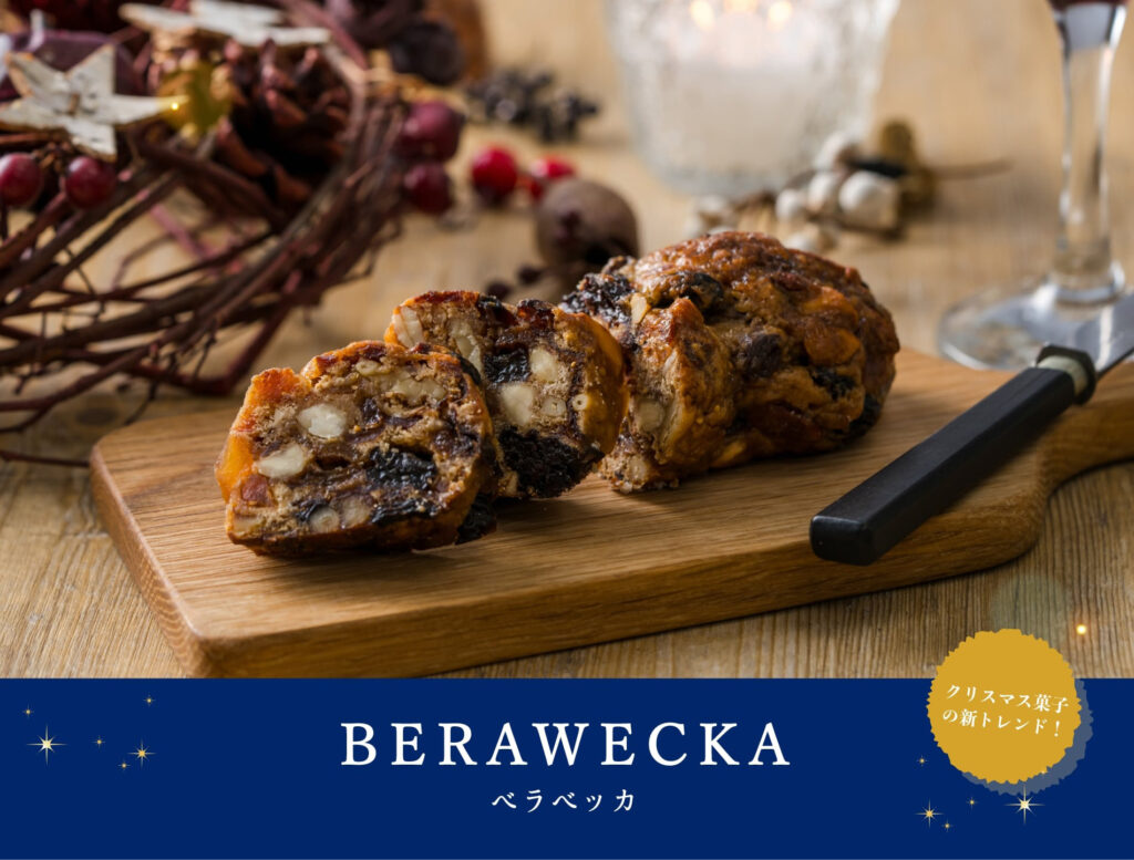 「ベラベッカ」とは、フランス語で「洋ナシのパン」という意味で、フランス・アルザス地方で古くから愛されているクリスマス菓子です。キルシュに漬け込んだドライフルーツや、ナッツなどを少量のパン生地でひとまとめにして焼いており、まるでフルーツをそのまま食べているような贅沢な味わいが魅力。クリスマス時期にいただくシュトーレンと同じく、ベラベッカもクリスマス当日まで少しづついただきながら楽しむことが出来ます。